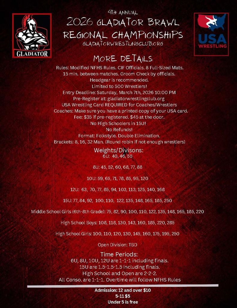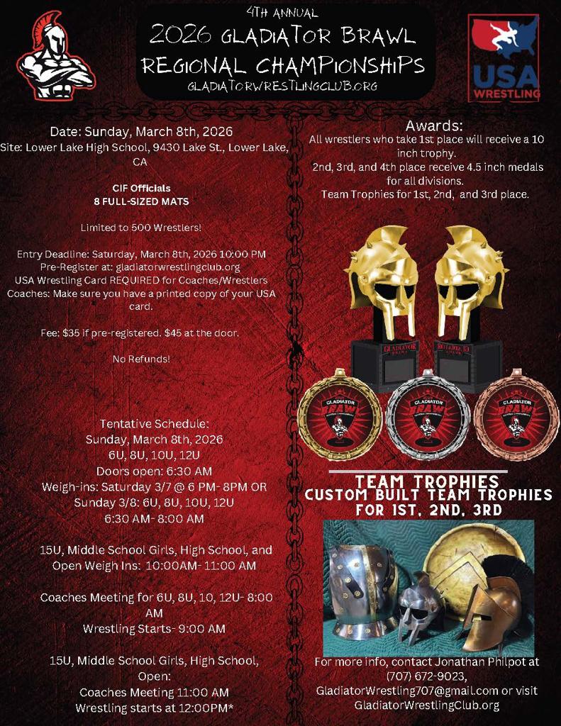 Gladiator Wrestling Club is established in Clearlake in 2022. Our club is dedicated to teaching and promoting the sport of wrestling to all those in Lake County! Our responsibility is to advocate, promote, coordinate, and provide opportunities for wrestlers to achieve their full human and athletic potential. Our club values integrity and fairness while teaching self-discipline, respect, confidence, and hard work. For more questions contact Club President Jonathan Philpot @ 707-672-9023 or gladiatorwrestling707@gmail.com